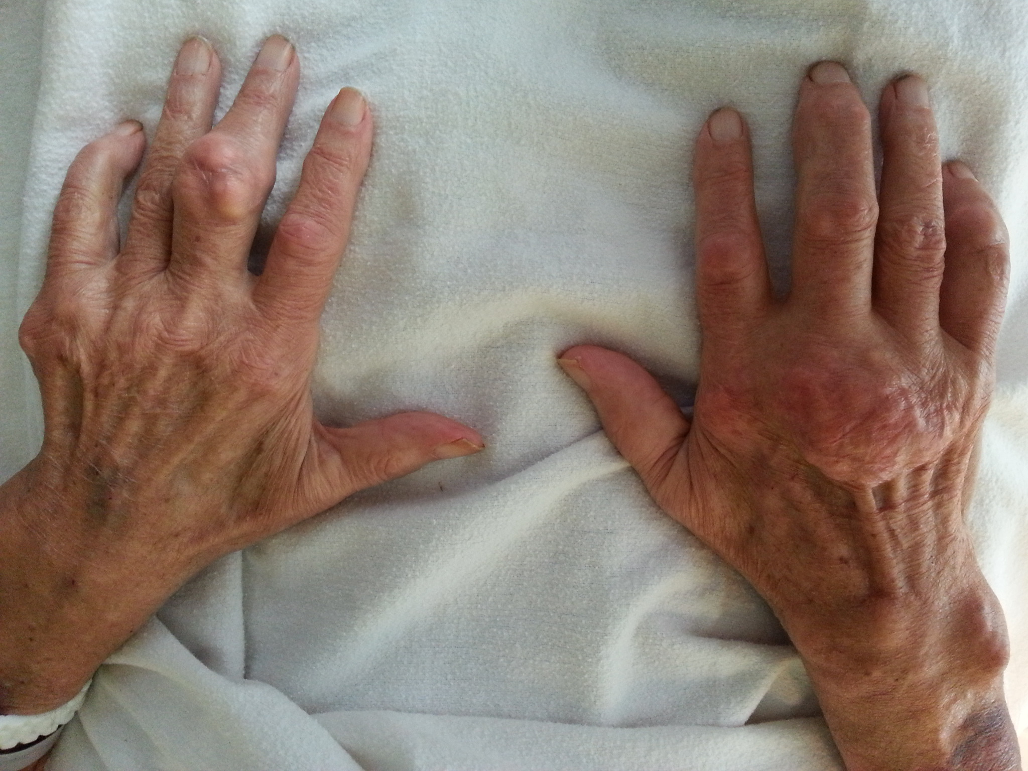 Lægen kan se et hævet, ømt, rødt og varmt led. Ved tilbagevendende sygdom kan der også ses knuder i huden, især på ører, fingre og tæer.